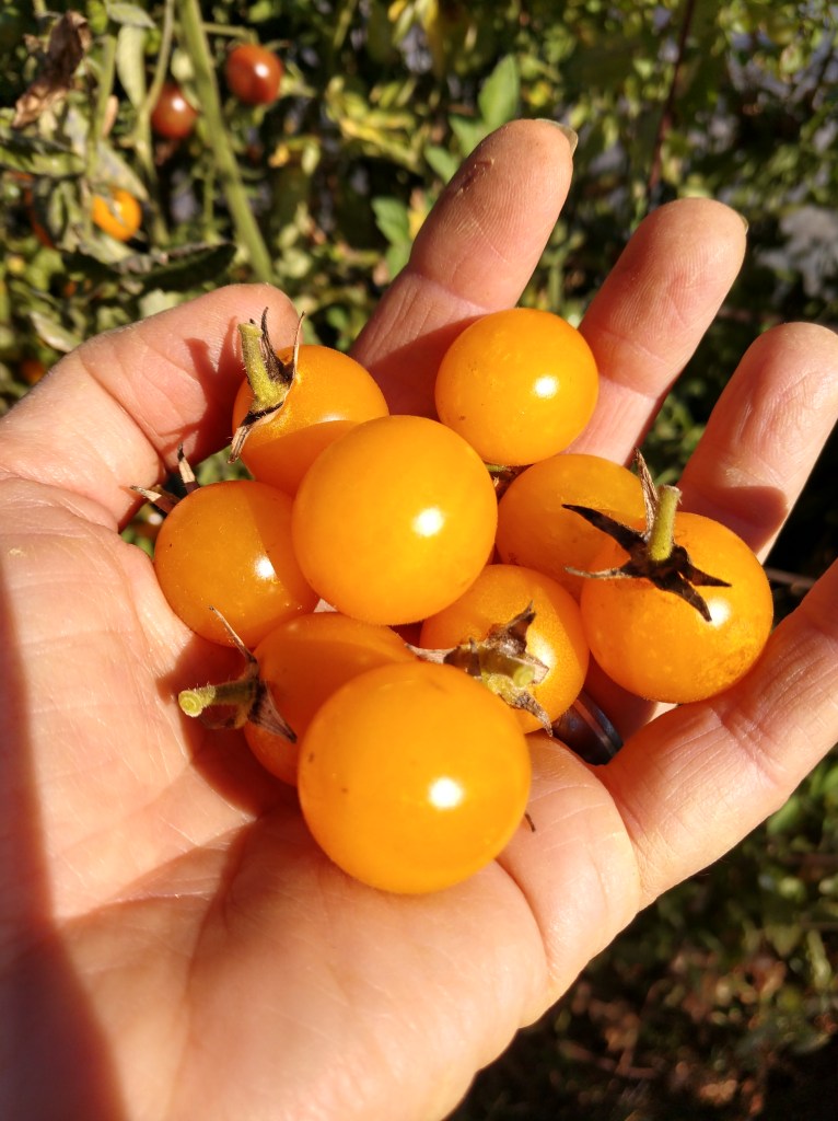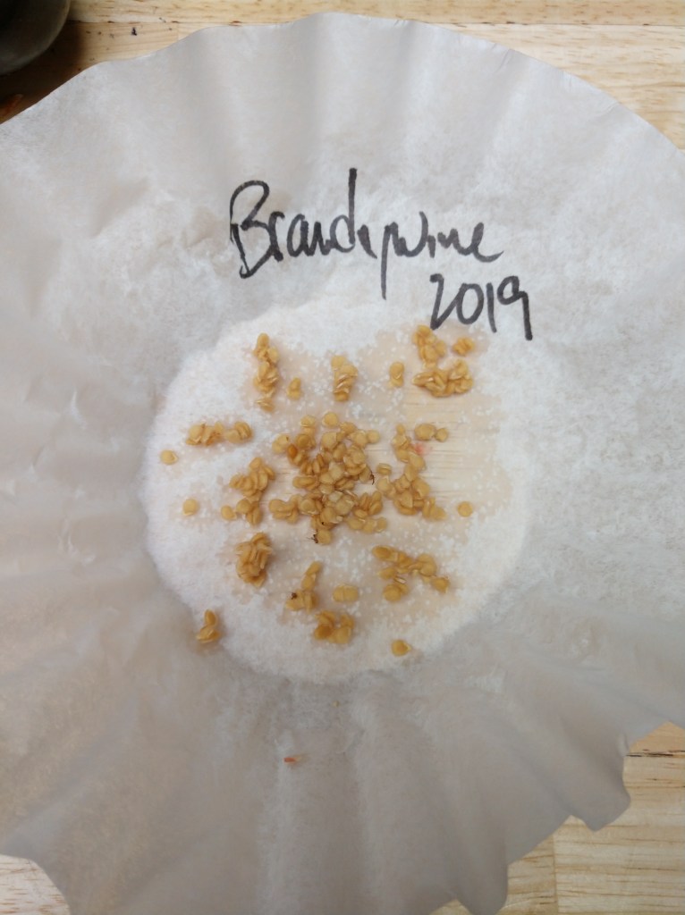So, back to tomatoes. Tomatoes, as mentioned, are generally very self crossing. If you look closely at their flower structure, you can see that the stigma (the female receptive part) is basically enclosed and covered by the stamens (the male parts that produce pollen). So its very hard for bees or wind to accidentally get pollen from the stamen on one flower to the stigma on another flower. Hence, they are mostly self-crossers (my crazy orange cherry cross not withstanding). From a talk I attended at the National Heirloom Expo, tomatoes are thought to be about 97% to 100% self fertile. In this same talk, by Joseph Lofthouse, I learned that to ensure you get a good sampling of self-crossed seed, you should collect seed from three tomatoes of the same variety. For a FASCINATING look at Lofthouse’s work to create an out-crossing tomato (encouraging genetic diversity in the face of climate change) check out this piece on landrace gardening (and then go down that rabbit hole, googling his name, for about 4 hours). Very interesting work!