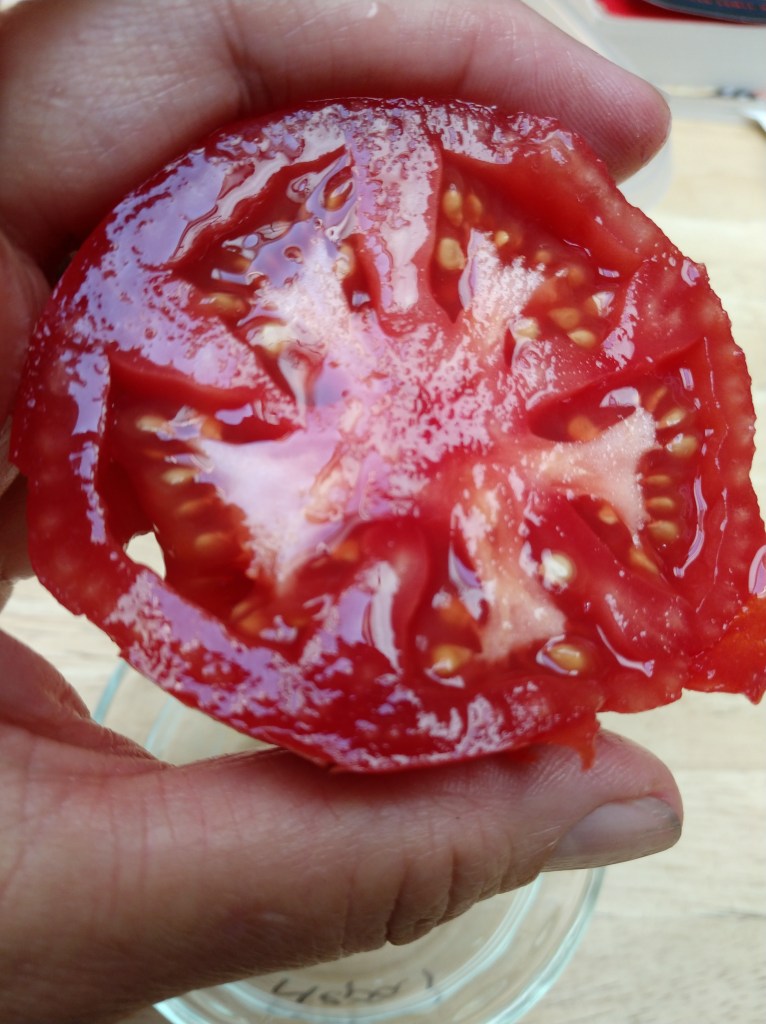 Tomatoes I want seed from. Note writing on them with sharpie so I don’t mix them up.