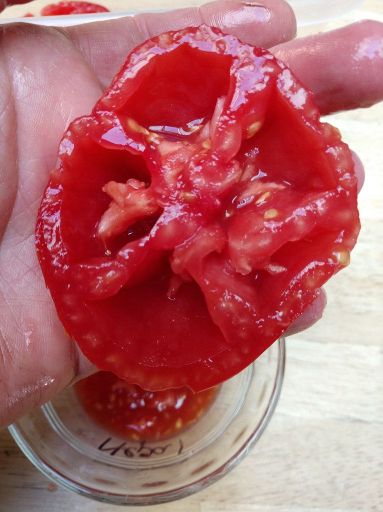 - Chose tomatoes to save seed from. This can be the earliest ones to get ripe, the best tasting, the biggest, the prettiest…whatever traits you want to preserve. If I have multiple of the same variety planted in a block, I like to chose fruit from a middle plant, as there is less chance of a cross with a different type. In order to keep the varieties straight, I write right on the tomato with a sharpie when I’m picking.