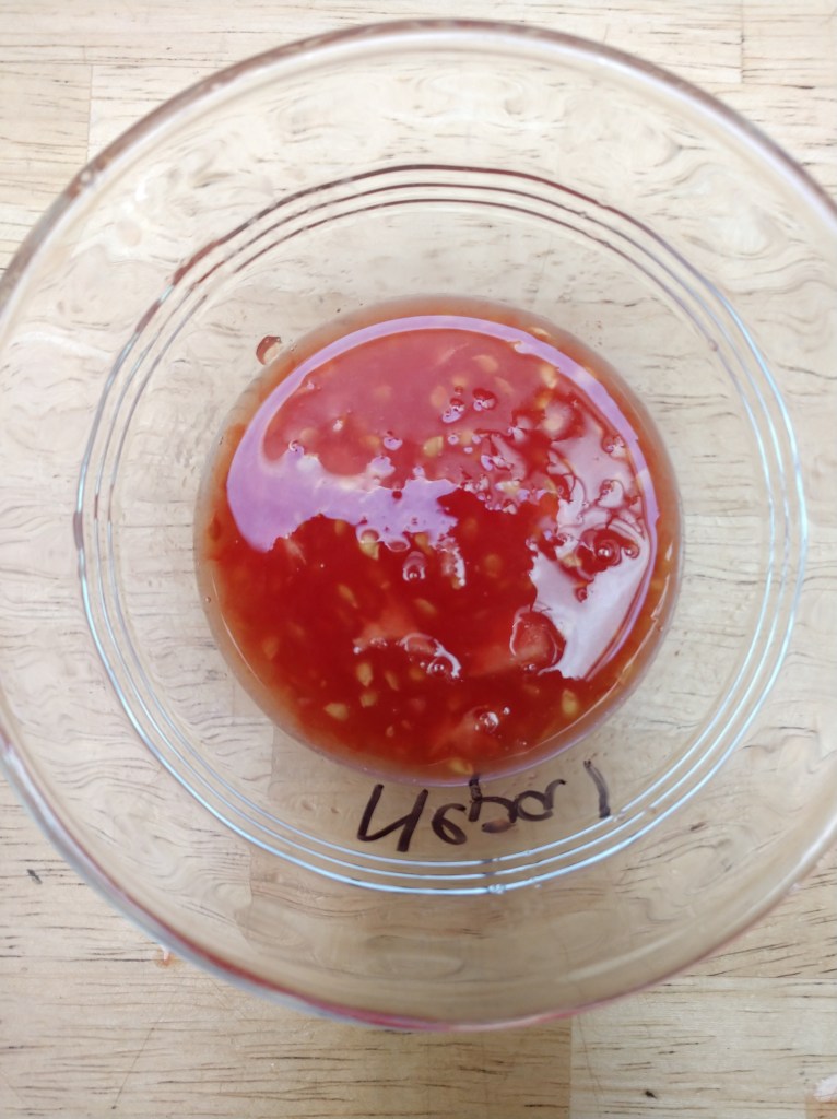 - Cut tomato through its equator and gently squeeze out the seeds and gel (or use your finger to remove most of this mix). Place seed/gel in a small container. Write the name of the variety on the container in permanent marker. (It comes off of glass with rubbing alcohol later).