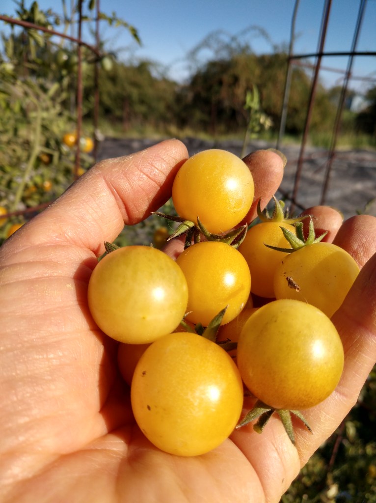 I grew out a few new varieties of tomatoes this year. Four new cherries, a black, a white (really a pale yellow), esterina (yellow) and skakura (red). All were an attempt to find cherry tomatoes that didn’t split on the vine, after picking, and in the display box at market (looking at you Sungold – love you, but dang…). I also ended up with an accidental cherry when growing out some saved seed from a German Pink. I always put my German Pink’s near my cherry tomatoes, and it was clearly a cross with sungold. Kind of a fun slightly larger very round bright orange cherry. And I threw in a Brad’s Atomic Grape Tomato from a plant sale, because I was swayed by its amazing looks. Turns out its not much on flavor in our growing environment. Tough skin, not terribly sweet, and the plant struggled to keep up all season while EVERY other tomato plant I had did just fine. So definitely a dud for me.