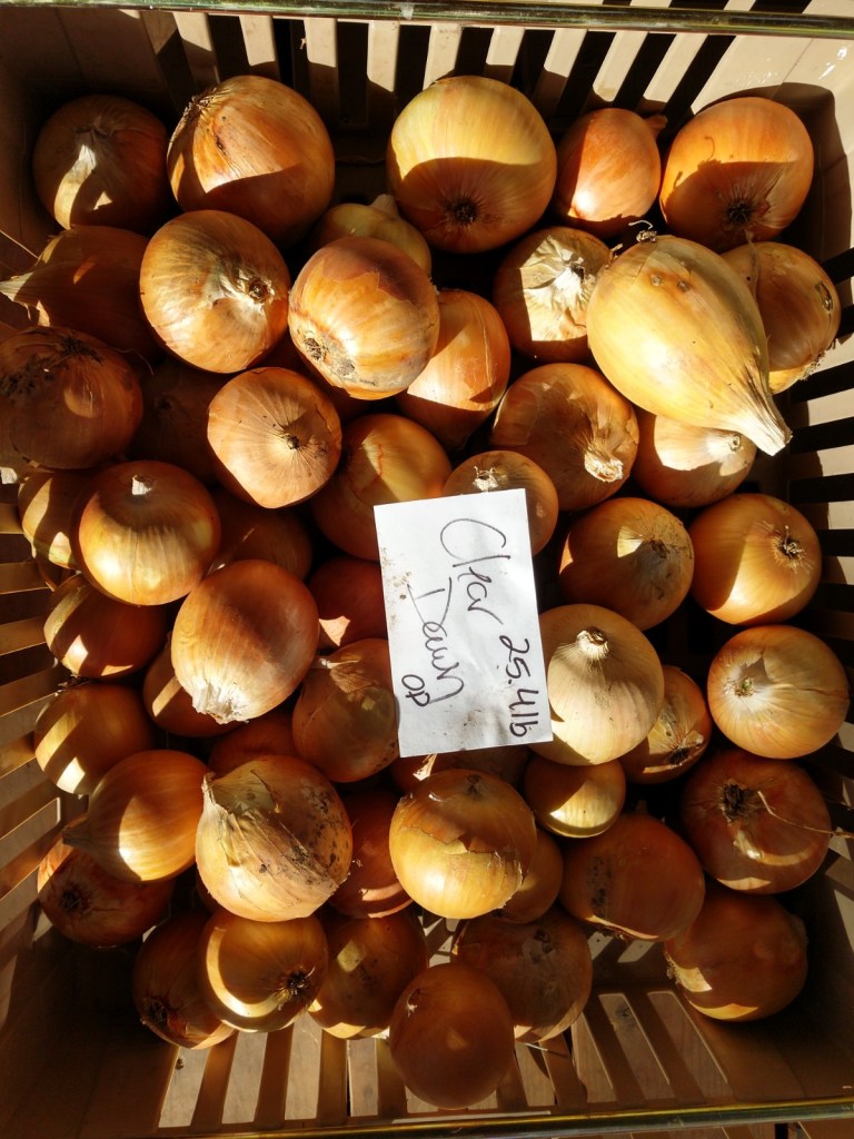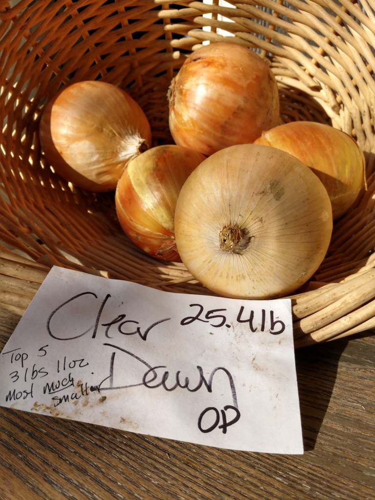 Clear Dawn Yellow Storage from Fedco. Described as “Bred out of Copra. The best open-pollinated storage onion, Dawn has gotten better and better over years of selection with great storage capability. 8–10 oz average and very hard.”