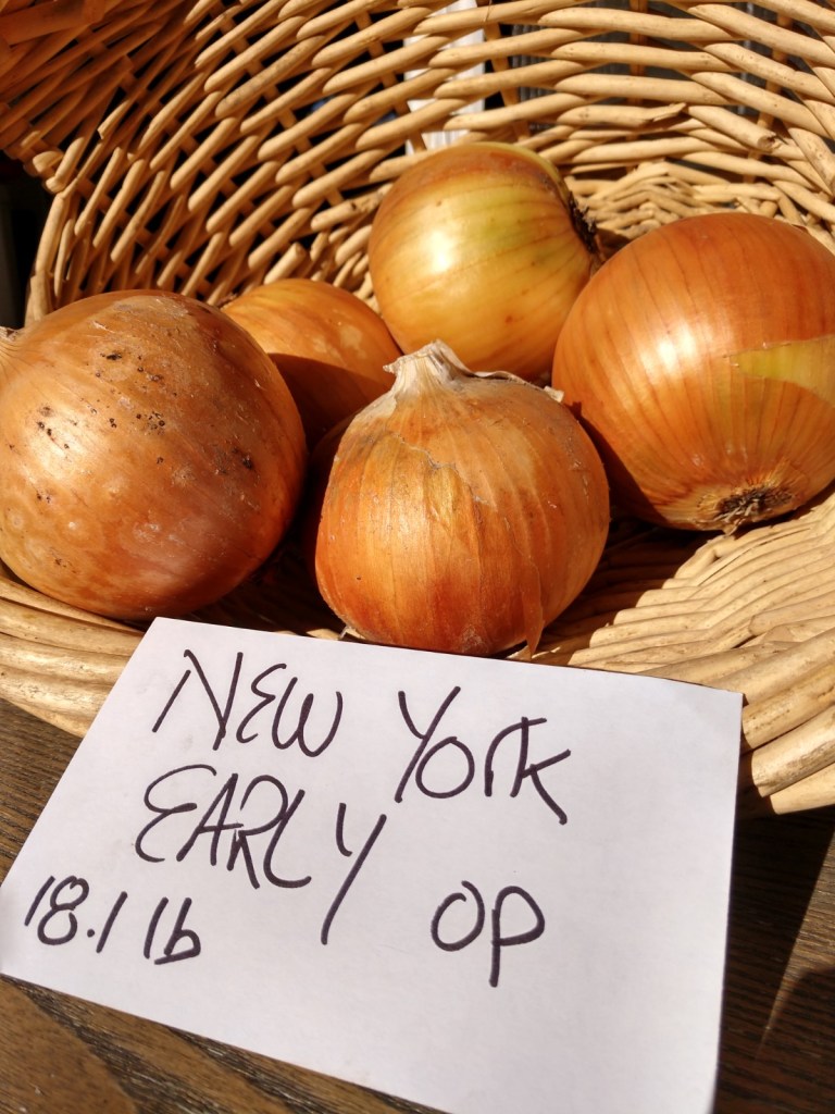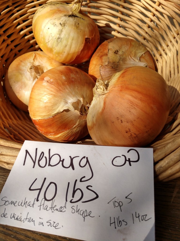 Newburg Yellow Storage from Adaptive Seeds. Described as “Simply the best open pollinated yellow storage onion. Originally selected from a European commercial hybrid storage onion, it was reselected under and for organic production. The tightly wrapped, copper- skinned, spherical bulbs are known for their excellent storage life, crisp texture, and medium hot rich flavor. Newburg has out-yielded hybrids when trialed under organic conditions, making it a great replacement for the classic hybrid, Copra.”
