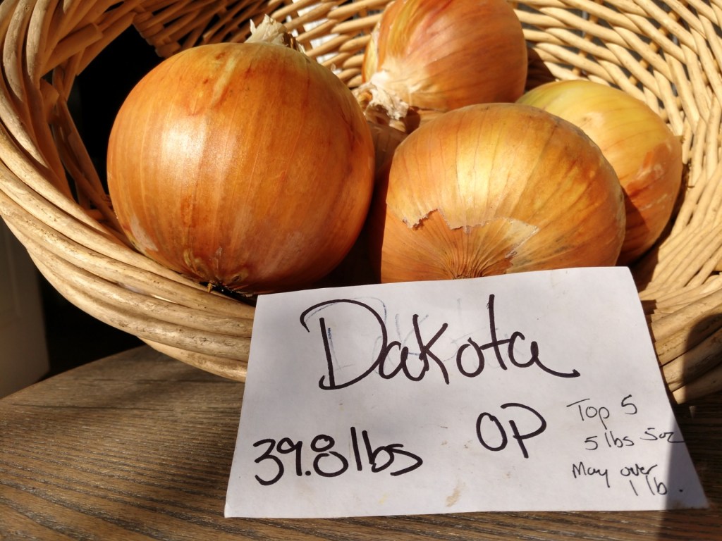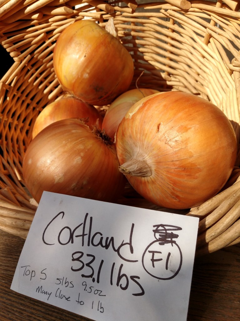 Onions were placed into open storage bins (one per variety) and stored in the greenhouse to dry down. They were then cleaned up, trimmed up and weighed in early October. There is some debate about whether or not people WANT onions that are over one pound (16 oz). I had a LOT of big onions.