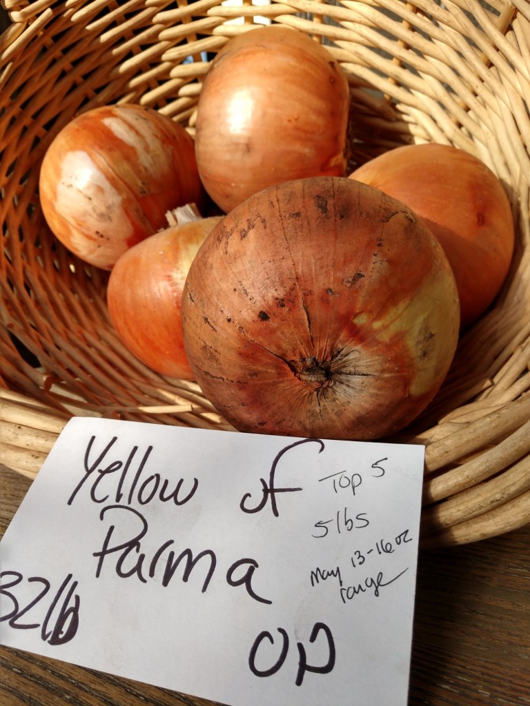 Yellow of Parma Yellow Storage from Seed Savers Exchange. Described as “A top-quality, late-maturing onion with golden, globe-shaped bulbs weighing an average of 1 pound, this variety hails from northern Italy. It has a mild, sweet taste when fresh, but its flavor intensifies when it is stored. One of the best onions varieties for storage.”