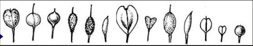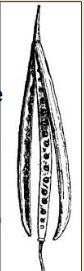 The seed pods in this family are also distinct. Called a silique (drawing above) or silicle (drawing below), when ripe, the outside walls of the seed pod fall away leaving the translucent interior portion holding the seed intact. Pods always spiral up the stem a bit like a staircase. Seeds themselves are small and round and, well, look just like a mustard seed. This year I managed to get some of mine mixed up, and had two broccoli and a kale in the kohlrabi bed and a collard green in with the Chinese broccoli, because you can NOT tell them apart when the plants are small.