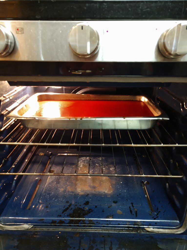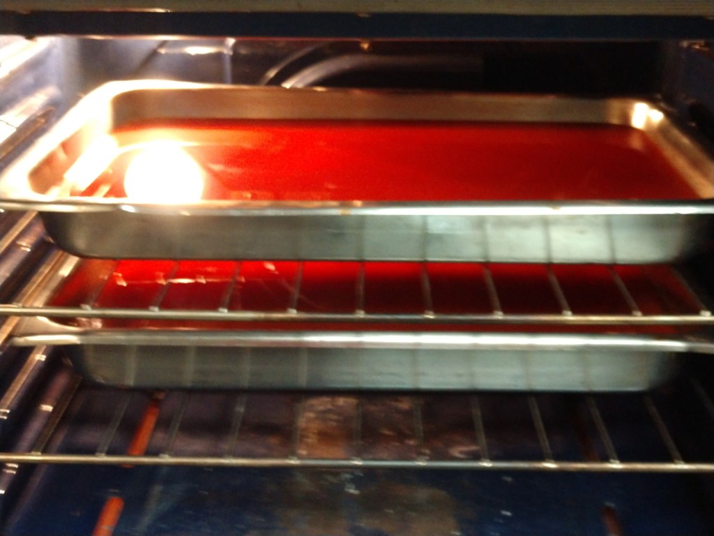 - Continue to bake, stirring about every hour, until you are ready to go to bed. Depending on how early you started and how large your containers are, you might be able to consolidate your pulp down to one pan by the end of the day. Turn off the oven, (leave a note so someone doesn’t turn it back on with your tomato paste still in there) and go to bed. It will be fine in there. It’s dried out enough and is acidic enough that it’s not going to grow anything nasty overnight.