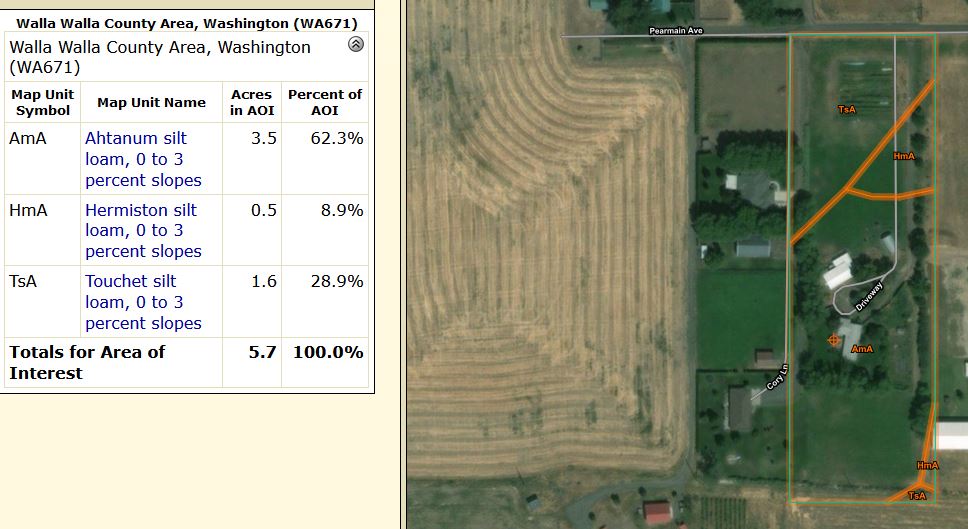 You can research your own property’s soil starting here. Read directions, then click on the green WSS button to start. You can REALLY go down the rabbit hole on this website. It will make your head spin. Our property’s soils are made up of Touchet Silt Loam, Ahtanum Silt Loam and Hermiston Silt Loam. The garden area is on Touchet Silt Loam. This soil came from alluvium flood plains, which means its a mix of materials, mostly silt, deposited by flood waters.
