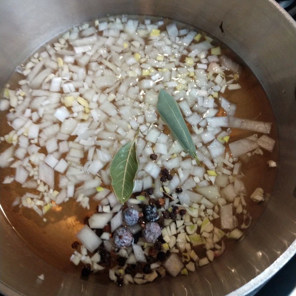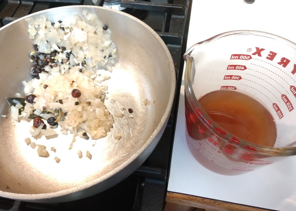 - In a small saucepan, combine vinegar, wine, onion, shallots, garlic, bay leaf, peppercorns, and juniper berries and bring mixture to a simmer over moderate heat. Simmer mixture until reduced by two thirds, which depending on your pan and heat, should take about 15 minutes.