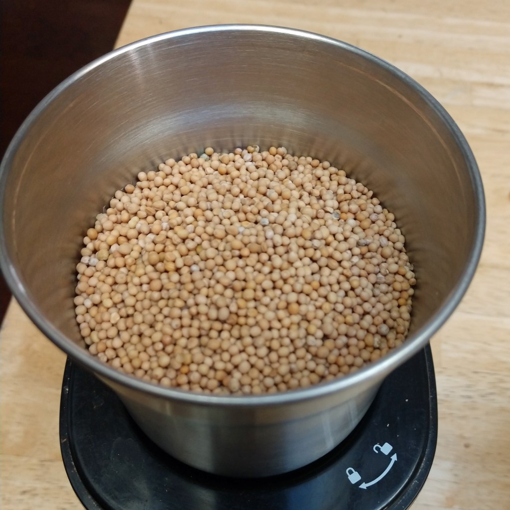- Grind yellow mustard seed in a spice grinder until fully ground and uniform. Measure out 3/4 cup of the mustard powder (3/4 cup of whole seed will give you way more than 3/4 cup of powder, as the grinding fluffs up the powder considerably. Alternatively, just buy 3/4 cup of yellow mustard powder).