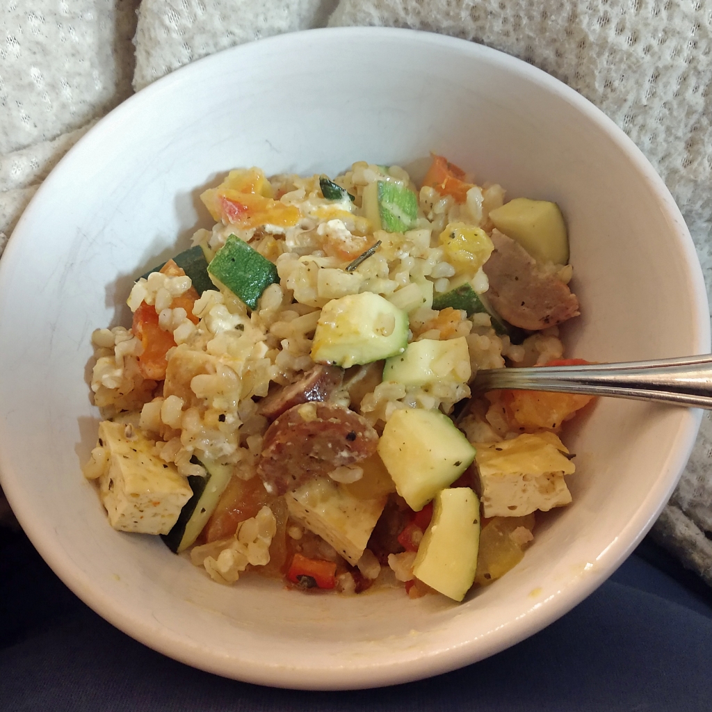 Many years ago, I worked for a non-profit environmental education organization. The first time I had this dish, the founder of the organization, who was vegetarian and a force of nature, brought it to a potluck. I’m not normally a tofu lover (and I’ve even gone so far as to make it from scratch from ground soy beans) but I loved it in this dish and asked her for the recipe. Here are her original directions: